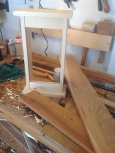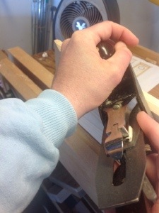 The front panel for the piece is designed as a raised panel. This is all done with a hand plane, in this instance I used a Stanley number 3. Marking off the edges of the panel 3/8″ and the panel at 1″. I placed the panel in my vise and working the ends first began shaving off the material. The picture is very poor so let me describe the process. I angle the plane and begin shaving material from the edge of the board working back and forth until I have cut the reached the lines, I then repeat on the other edge and the sides. This order is important since It allows you to plane off any spelching when you plane the end grain.