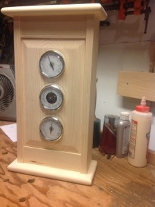 20130421-185527.jpgA few finishing touches and the weather station should be complete. First is to cut the holes for the instruments. Using a compass I drew three circles on the panels and then using my hand drill put a hole in each one to allow me to pass the blade from my saw. I then cut each circle out. I left the holes rough since they will be covered by the instruments.