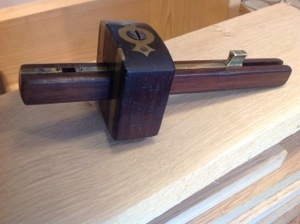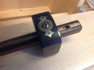 The first was this wonderful mortise gauge. I already have two marking gauges, the first is a Veritas wheel marking gauge.  Obviously since it only has one marking cutter it is not designed for mortises (although you can use it that way with a loss of accuracy). I like the Veritas gauge ,it holds its setting and works well. However it is not a mortise gauge. The second is a mortise gauge from Crown Tools. Say what you want about the quality of crown tools…but this gauge has worked well for me and the only real complaint I have is it’s comfort in the hand. The corners are square and dig into your hand.