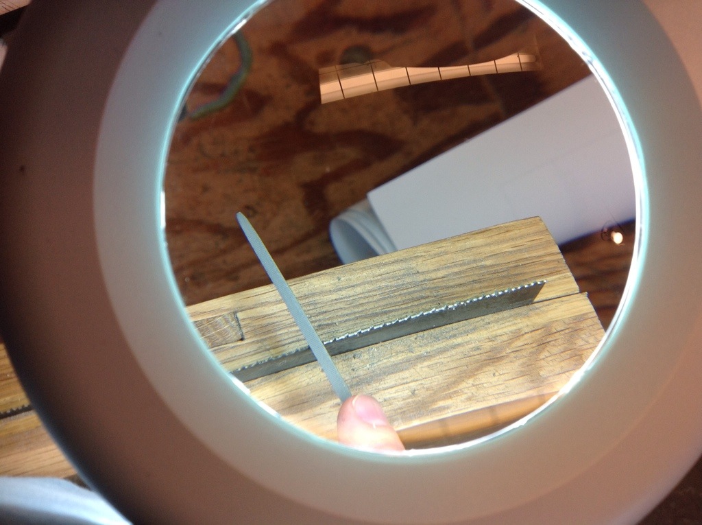 I tried one of those for a while. Not enough light or magnification for me. I finally went with an Optivisor and a task lamp, that proved to be much better setup for me. Another thing that really helps me to keep track of which teeth have been filed, is to coat the teeth with Dychem layout fluid, before jointing. It really makes the flats standout, and as you file the teeth, the Dychem comes off, so you know they are done.