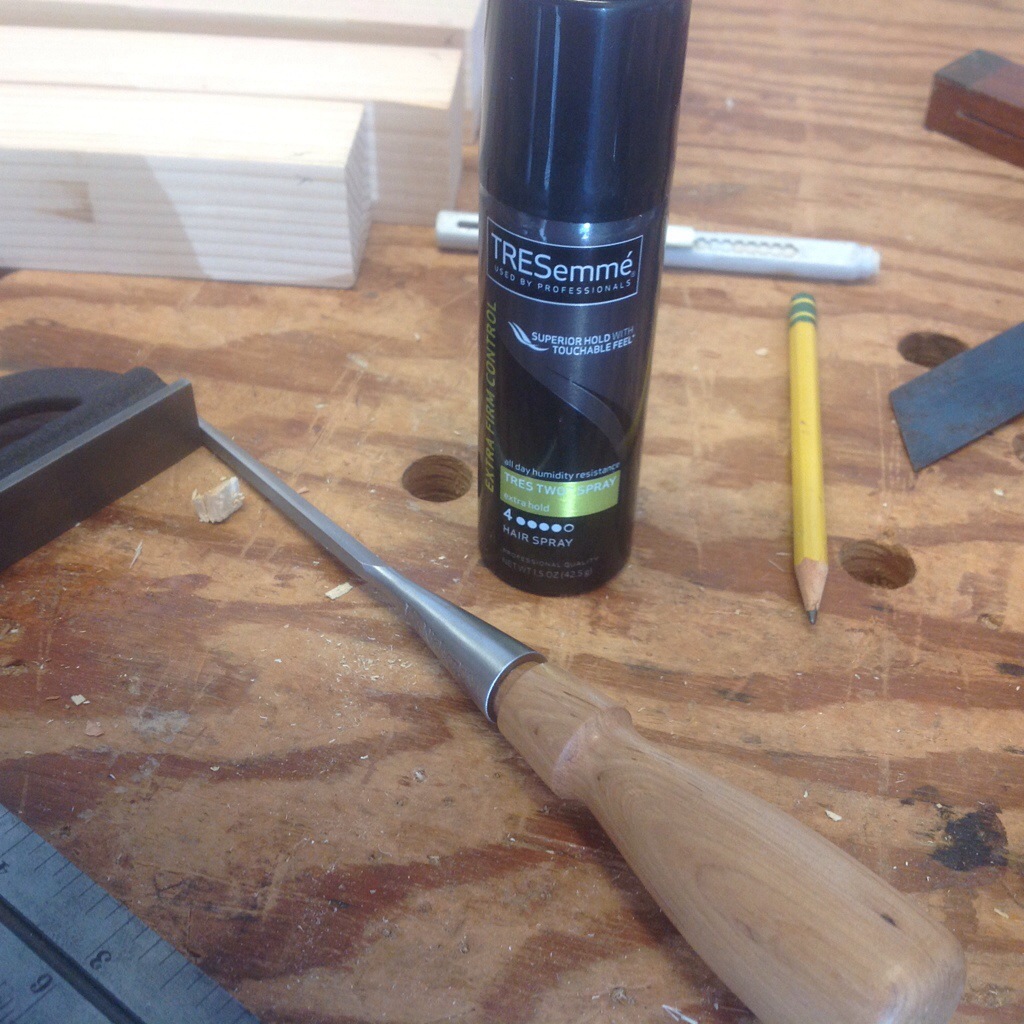 The chisels that I have used for a few years are socket chisels made by Lie Nielsen. Generally they have performed well and they appear frequently as tools used in the works of others. I have one frustration which is with the number of times the handles come loose from the chisel. It is generally related to humidity and occurs mostly over the winter months when I assume the humidity is at its lowest. After a couple of years I have experimented with methods to keep them together and been successful with the exception of the 3/8″ chisel. It defies my efforts. So today I reached for my secret weapon.. My daughters hairspray! In the past I have used my wife’s hairspray. But clearly I had to move to something stronger….