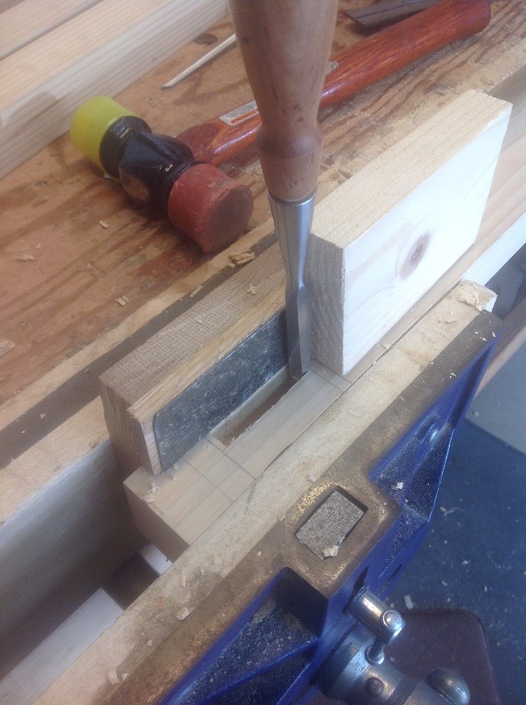 Finally I have the opportunity to make progress on the stool. Taking the time to carefully lay out the angle and mortises, I begin to chop out the joints. There are two jigs that I am using to hold the correct angles shown in the picture.