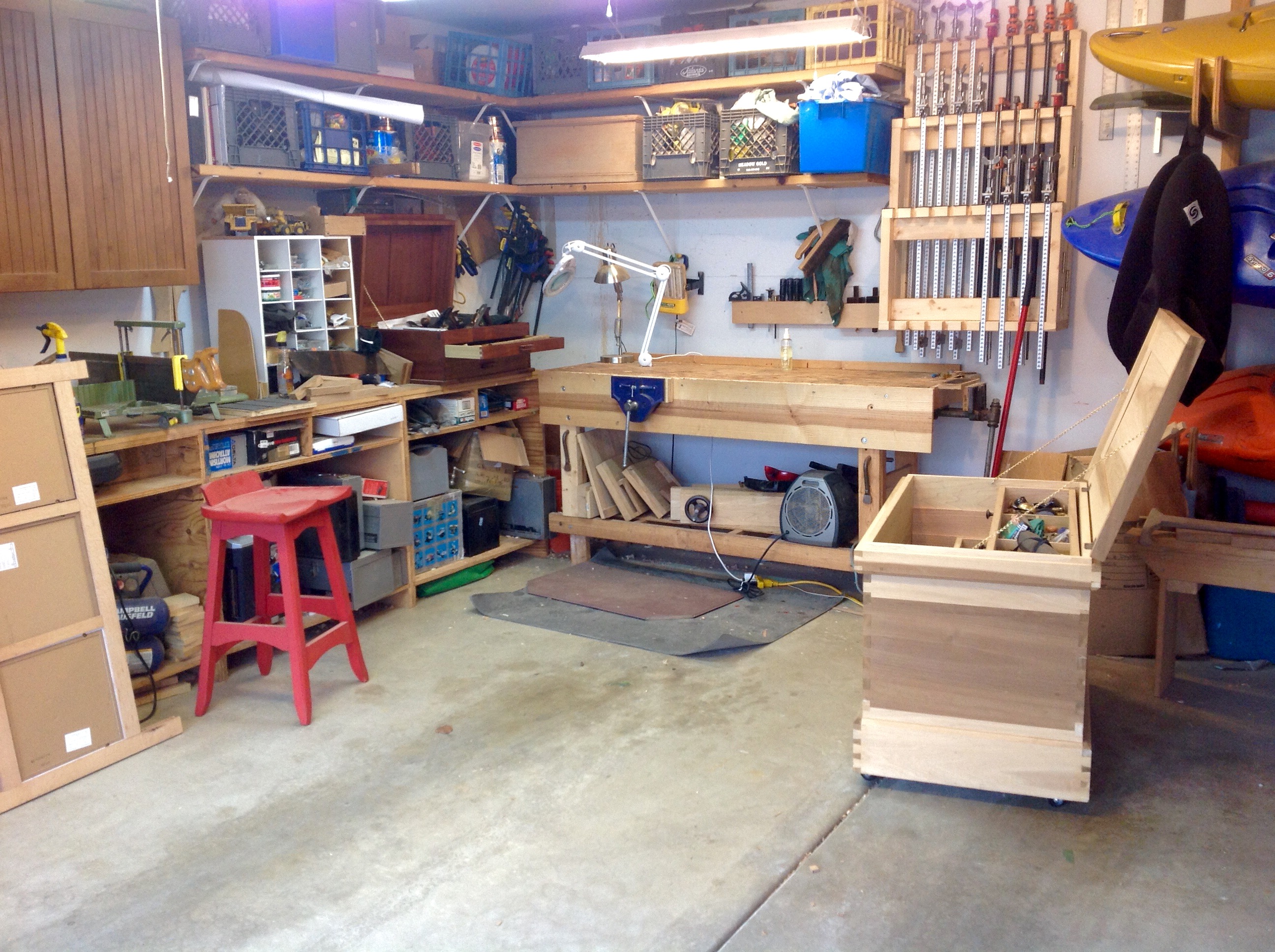 Before you is a bench, not a Nicholson or Roubo, but a bench built by a teenager and his father, modified and strengthened to fit a new purpose. Looking to the right is a large chest unfinished, but inside tools stand oiled and sharp anticipating the next task. On the left a smaller chest immediately at hand. Beneath the lid sit planes needed each day wood is worked. In the first drawer, chisels, marking knives and measuring tools. The second drawer contains saws, R.Groves from the 1790’s and Bad Axe Tools from LaCrosse. Across the shop,diamond plates ready to sharpen, unfinished projects and lumber unworked.