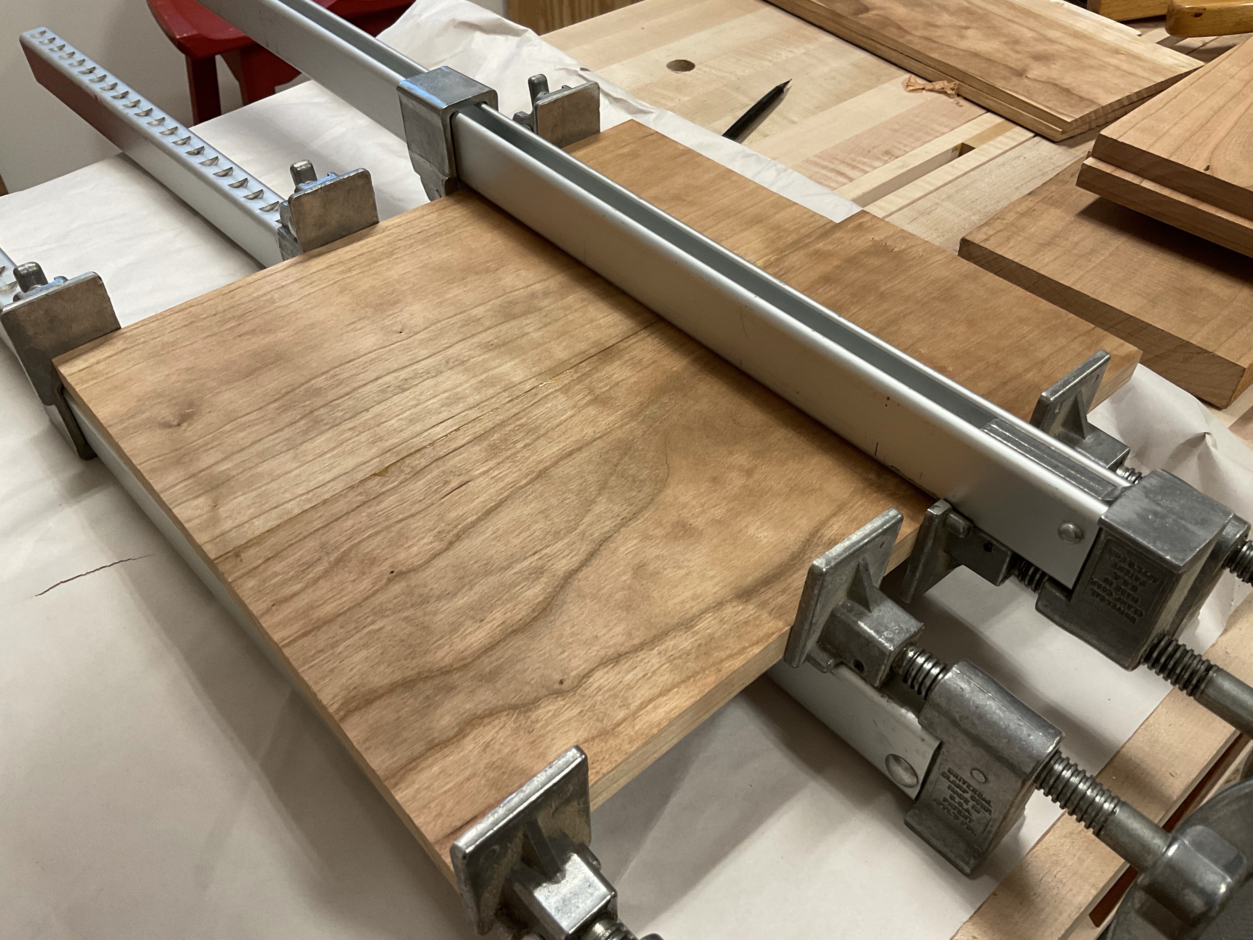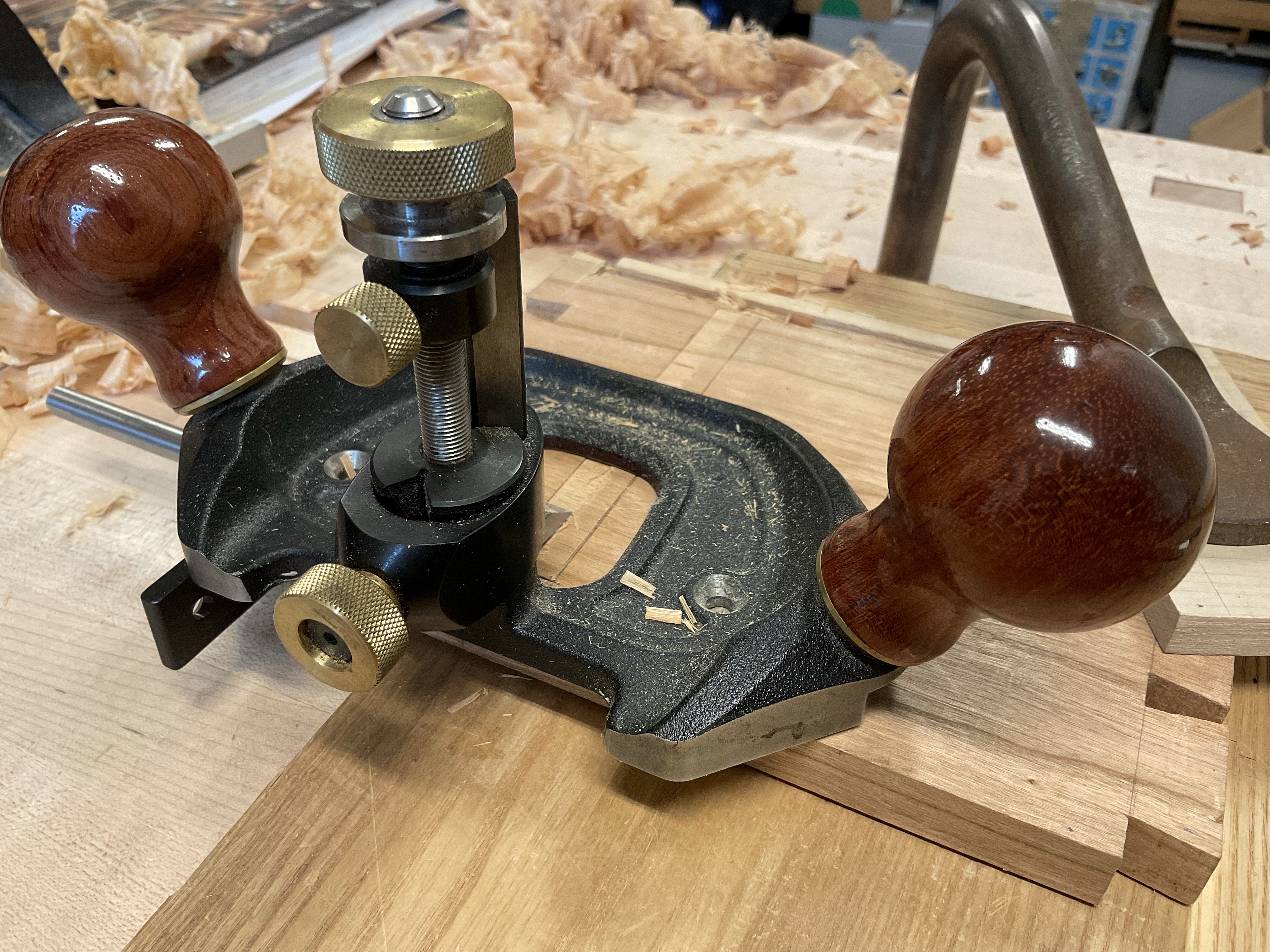 The shelf is wider than the boards that I have on hand so I did a quick glue up and planed it down to 1/2 inch. It’s been some time since I used the router plane and it is definitely one of the most useful specialty planes that I own. This one happens to be a Veritas since I had a very difficult time finding a used plane when I first began using hand tools. Needless to say I have been very happy with it. Since the rabbit was in a couple of inches from the edge I cut across the board with my marking knife and then used an edge guide. You can see a corner of the guide at the bottom of the plane in the photograph above.