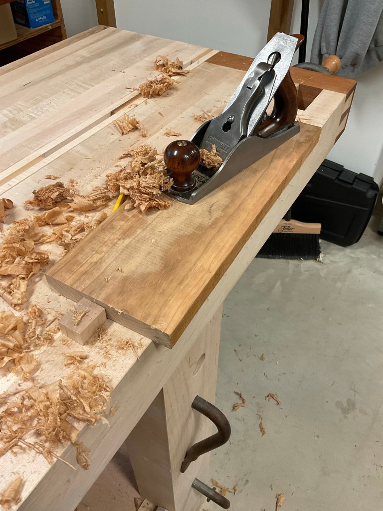 The cherry board that I have on hand is 5/4 and I need to get it down to approximately 1/2”. It’ll work great because approximately half the board is the pith. I used my Bad Axe Tool Works D8 saw to break the board down and there was a big smile on my face the entire time. The saw was singing and dust dropped quickly onto I the floor. There is something very satisfying about cutting cherry with a hand saw. If you’ve never used a Bad Axe Saw try one, the filing is magnificent. Even if you don’t get the chance visit the web site its full of great information about saws, saw sharpening etc.