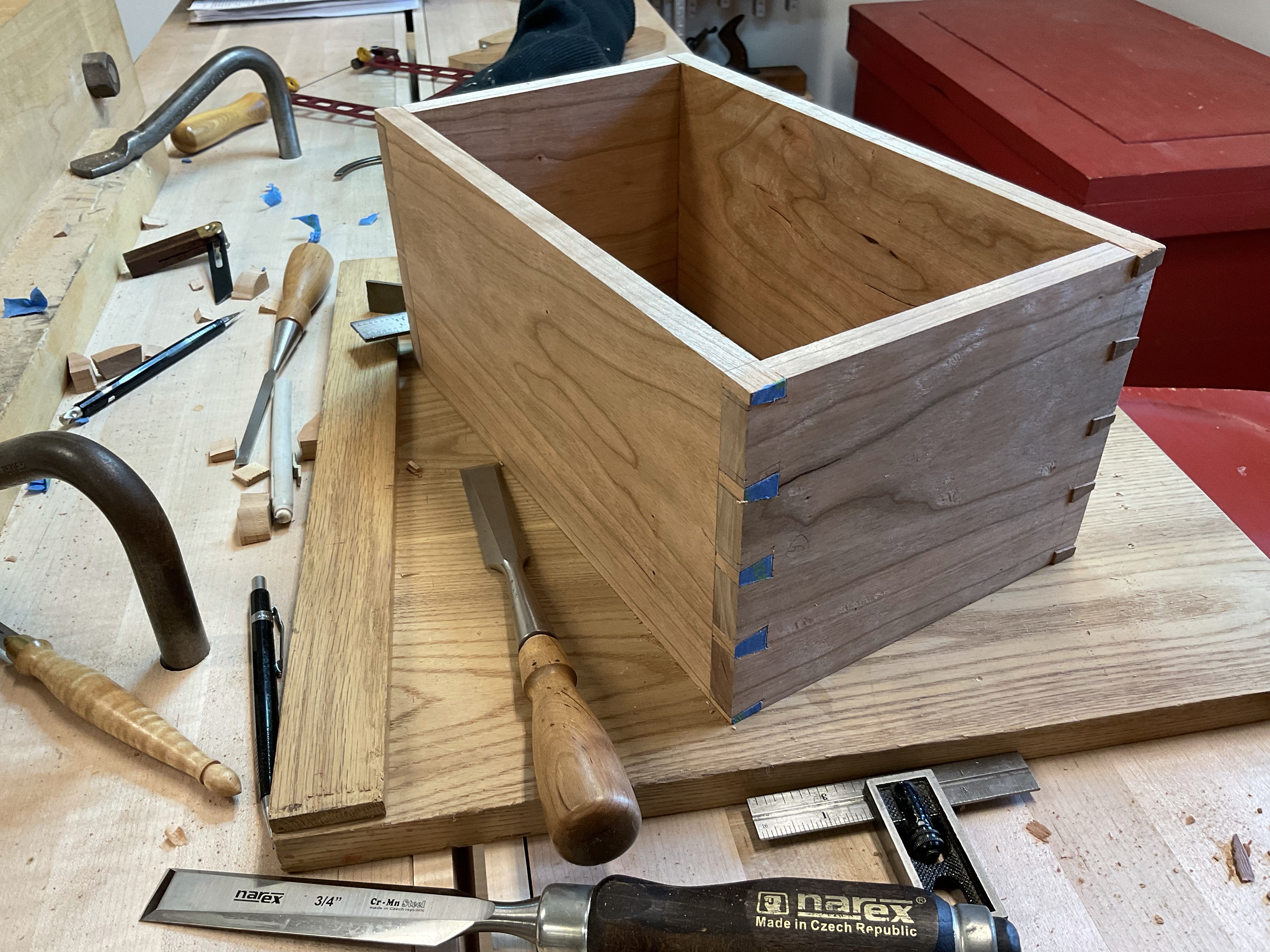 Looking through the posts on my site it’s been a while since I made a dovetail joint. The last appears to be the Roubo End Cap that I completed in 2019 and even longer ago since I made a box. Needless to say, I am rusty in my layout skills. Taking a few minutes to brush up on the use of dividers and dig out various tools I remembered the article that Mike Pekovich wrote about using blue tape and decided that this would be great time to give it a try.