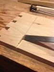 Lesson one began with making a dovetail, yes the joint that makes woodworkers tremble in fear. Paul’s simple instruction and process was concise and when put into practice produced some very nice results. This was not my first time cutting this joint, but it was the first time I began to really understand how to effectively cut it. I struggled with the saw initially, but made my way through the joint. Paul next took time working with the class on sawing technique, in particular only using the weight of the saw to make the cut. After watching, and listening (a critical part of understanding the performance of the tool) we made many test cuts. Brilliant, this was one of those moments that I came to the class to grasp. Once I truly unloaded the saw, it was poetry in motion. The second item that Paul passed on concerned correcting a mis-aligned saw cut. If the saw begins to wander from the line it does not help to apply pressure to the saw plate to force it back to the line, this in fact makes the mis-alignment worse because the curve of the plate against the side of the cut forces the teeth in the opposite direction. Instead lift the saw up to the point where the problem began and use the teeth to cut down your planned line. It seemed obvious when he explained it to the class, but it was another piece of information to tuck away.