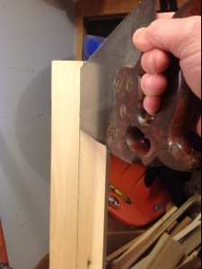 Next I used my marking knife to define the lines. looking around the garage I thought that the best way to make this cut may be using my table saw with the blade angled. Realizing that it still has a dado blade installed, pushed up against the wall and has a whole pile of “crafty stuff” piled around it, perhaps I could do this with a hand saw.