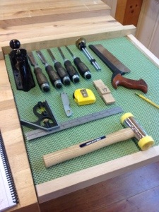 The basic tools that we have for the first day were set out neatly at each bench. As you can see there is a total of fourteen including a pencil. These are the same or similar to the tools Paul uses in his blog and the online Woodworking masterclass series. I noted some more tools in a box stored under the bench, which I am sure will be used later in the class.