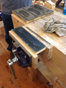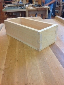 The pictures below are of the edge planing which is done without removing the heal of the plane from one side to the next and the planing of the sides which was done in the vise with a board raising the center. My fellow classmates range in age and experience and it is fun watching people complete their first dovetails and improve on their previous experiences. It was also fascinating watching Paul and his very talented assistant Logan demonstrate how to repair mistakes, many which became very difficult to spot. I bet on most of the museum pieces in the world there are many patches that go unnoticed.