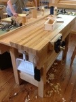A few years ago as I increased hand tool use, I began using a front vise and had to make several modifications. A 10″ wide board was added to the front along with doubling the leg width. Some cross bracing on the sides and the bench became very solid. My old vise stays on the side holding the strop for easy access. I made this bench as a teenager working with my father. It is a design from an old friend of his and has served well. Starting out, I certainly wouldn’t shy away from this bench. It’s cheap and works well.