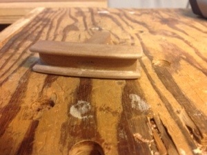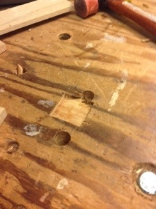 Cutting away the area surrounding the cavity with a chisel was simple. I found a scrap of poplar in the bin and cut it to rough size then placed it over the cavity and marked the edges with a knife. Cutting along the marks I fitted the replacement piece and glued it into place.