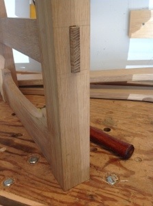 I quickly realize that there are a couple of through mortises that I have forgotten to trim the edges. I clamp them in the vice and then taking a chisel pop the corners off to refine the look. I notice a couple of joints are not closing up tightly and upon inspection remove a small amount of material from the tenon. Any pencil marks that remain are removed with and eraser. Next I hand sand each piece with 220 grit paper. This should be all of the sanding that is required. This process requires me to clamp and un-clamp the parts several times as I make the adjustments.