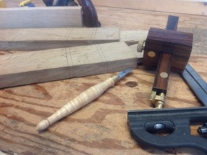 Today I’ve set out to compete the Under-shelf. Nothing particularly about it except some care to get the measurements correct and a series of mortise and tenon joints. Initially laying out the joints in pencil gave me the opportunity to view the layout prior to any permanent marks. I then marked the mortises with a knife and chopped them out with a chisel. Each one took a out 10 minutes. The tenons are 3/4 inch long and I marked them using a mortise gage. Funny thing but I found out one of them was significantly less than 7/8 inch and I had to cut a new piece. Where that piece of stock came from I have no idea!.