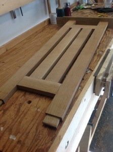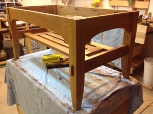 I’m begining to think about the glue up of this piece and it’s looking to be very complex. The under shelf is made up of this component and two rails on the sides. It appears that I need to glue up this component before I complete the mortises in the rails. That should insure a good fit and one less part to glue up at the end.