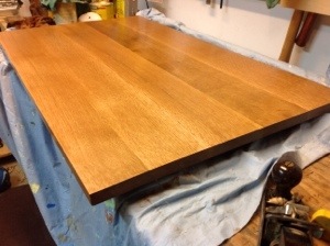 Fortunately I have planed, scraped and sanded all of the parts during assembly so all I have to do is touch up a couple of spots and remove a pencil mark or two and apply finish. Over the last couple of weeks I have thought about the best way to finish off the coffee table. Initially I apply a coat of clear de-waxed shellac to seal the sanded surface. Next I applied two coats of a mahogany gel stain . The red color of the stain will find the grain of the oak and add little bit of color without moving too far away from its natural color. On the lower portion of the table I finish with 3 more coats of shellac. sanding in between. Then I use steel wool and wax to provide a very smooth protective finish. Since I applied the de-waxed shellac I am able to use water based stain and a water based polyurethane for the top. I realize that as a coffee table it will receive quite a bit of abuse so I want to protect it as best I can. You can see the slightly darker board in the picture of the top. At this point I think it adds character and does not detract from the table. two more coats of Poly and I’m done.