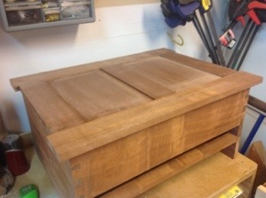 There is a defining moment in each project when you can see the finished project. Now that I have the carcass, bottom and lid in place I can step back and look at the dimensions and evaluate the chest. I like the way it looks and the simplicity makes the joints stand out. The next stage is to separate the lid and build the drawers. First I carry the chest into the house so that the glue can bond where it is warm!