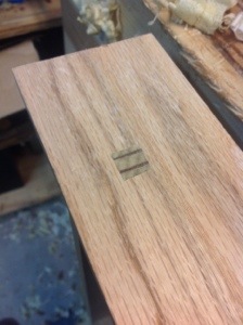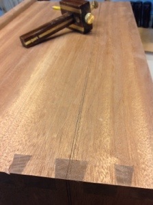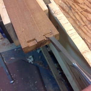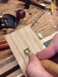 There are several ways to connect the back to the sides, dovetails, mortise and tenons, screws etc. Each of these work in its own way; for this project I was introduced to a method I have not seen before. A mortise is cut at the rear of each side and then a through mortise is cut through the side to house a pin. The pin is then held in place with wedges.