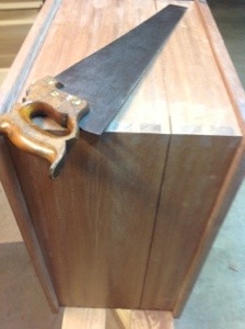 Sawing a straight line all the way around the carcass looks to be a little tricky so I clamp a guide to help me get started. Then using a panel saw I progress one edge at a time around the chest. Changing my hand hold on the saw gave me more control as I attempted to stay between the marks. Finally the cut is complete. I’ll need to take some time with a plane to clean up the edges, find some hinges, then I can begin the drawers.