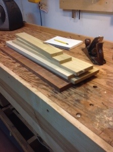 The drawer pull begins with four pieces of wood, carefully milled flat and square. The top and bottom of the pull are made from 3/16″ material . The pieces are curved along the length and the edges rounded over. I made the curve using a chisel and #4 plane, smoothing the curve with a rasp. The edges are rounded over with a mill file and the piece is sanded smooth.