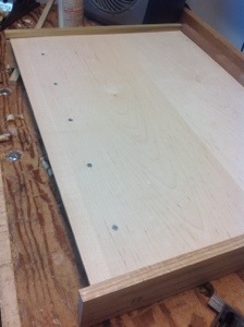 With the pinned housing joints complete, only a couple of steps left to complete the drawer. Mahogany plywood was cut to fit into the grooves and slid into place. I carefully drilled holes for 5 screws that will hold it. I then cut several 1.5″ pieces of wood and glued them into the edges of the drawer and bottom of the plywood. When the glue dries it will tighten the drawer bottom and prevent any banging of the plywood in the groove. You’re saying to yourself – what about expansion…….hopefully with plywood there will be very little.