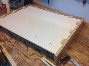 I test fit the bottom and make some more adjustments to remove any gaps and then prepare for the glue up. The bottom will be attached with glue and screws to ensure that it can support the weight of the drawer above. The screws will be counter sunk and I will plug them at some point. Once glued, I placed the box inside to allow the glues to cure at a reasonable temperature.