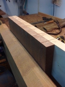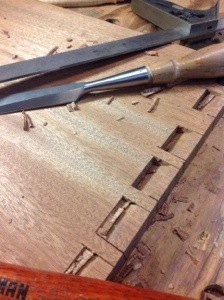 I place my chisel approximately half way into the waste and and on one side and give it a tap. Watching the split I can confirm that the wood will split where I intend. I then move to the other end and a place my chisel half way and make another test tap. If this works I go ahead and remove the waste. Using this method of checking each end of the tenon has been particularly helpful with the Sapele. The grain can change dramatically over a few inches and where I can use a chisel on one end of the tenon I may not on the other.