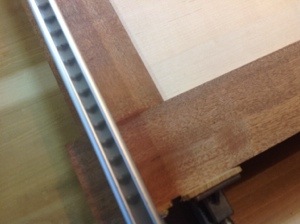 I saw two of the tenons and split the other two and quickly finish the mortise and Tenon joints. Most of the joints fit well, but I still have a little bit of work to smooth the joints. Rigging up a clamp n my vice I am able to support the bottom while I use a plane and cabinet scraper to smooth all of the parts. Sapele has been fun to work, but I could never have gotten by without my cabinet scraper.
