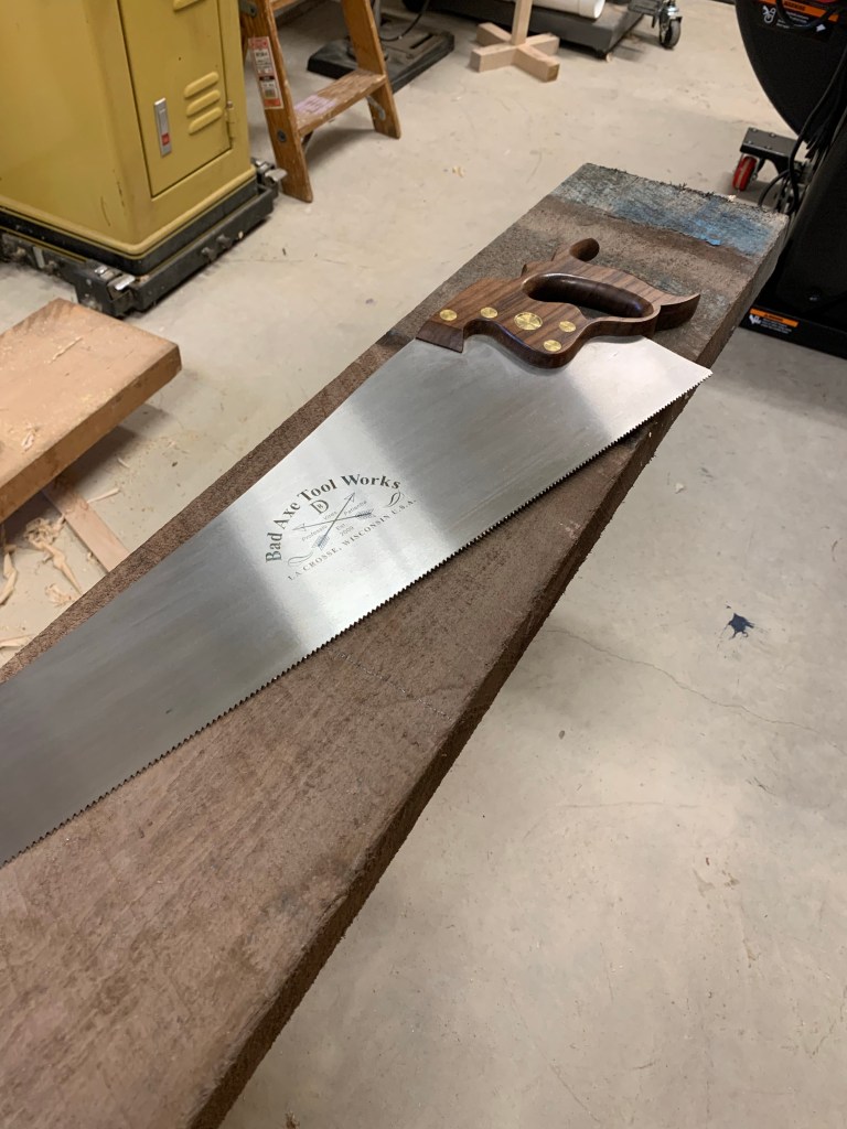 When I purchased the lumber I had smaller legs in mind so was content with 8/4. Now I’m going to need to stretch it so that I can get 2 1/4 finished legs out of it. Several of you have noticed an increased use of power tools in the last year. I have always used power tools where it makes sense and hand tools where they are most effective or I get more joy. Most projects start with the break down of stock and I always reach for my hand saws. Today I grabbed the Bad Axe D8. It’s pure pleasure to use this saw. As I write this post I went back and realized that I have had this saw for five years and It seems that long enough to truly recommend it.