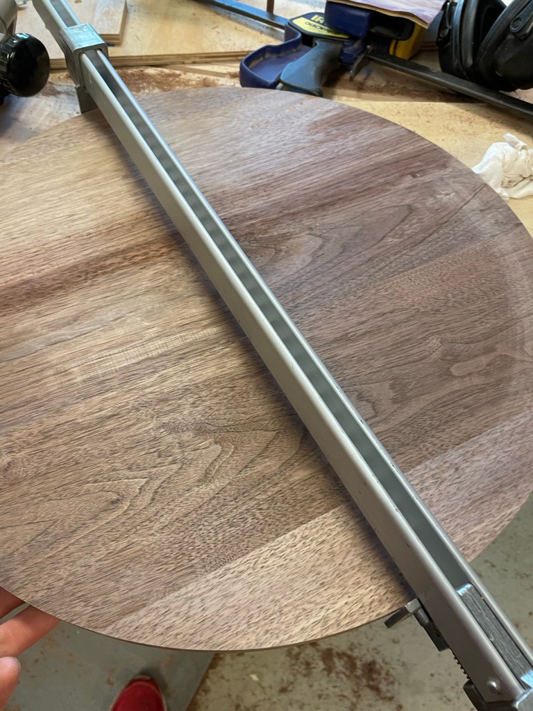 The underside was chamfered to lighten the appearance of the top. While I was using the router clamps were used to hold it in place. Unfortunately I did not ensure that the top was fully supported and after completing the routing and putting the router away the top cracked. It is a clean break over most of the length with a jagged edge on one end. I do not have pictures of my poor clamping method which consisted of a couple of boards underneath to allow the router to travel around the outside without touching the table top. I certainly should have used a better method.