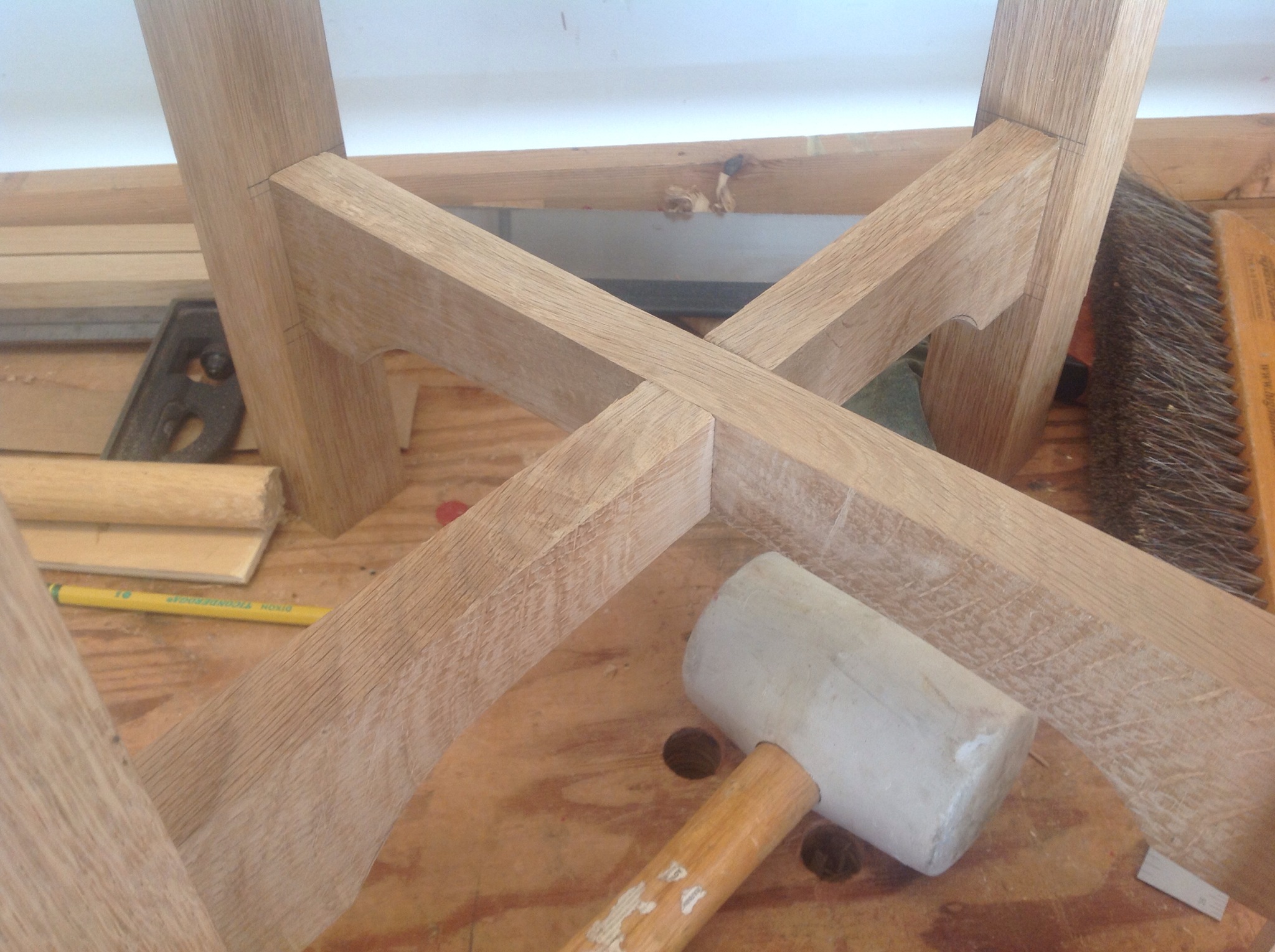 A beautiful morning to spend a couple of hours dovetailing the upper rails to the legs of the table. Then I began the careful process of erasing all of the pencil marks, chamfering the bottoms of the legs so they don’t splinter and a quick sanding.
