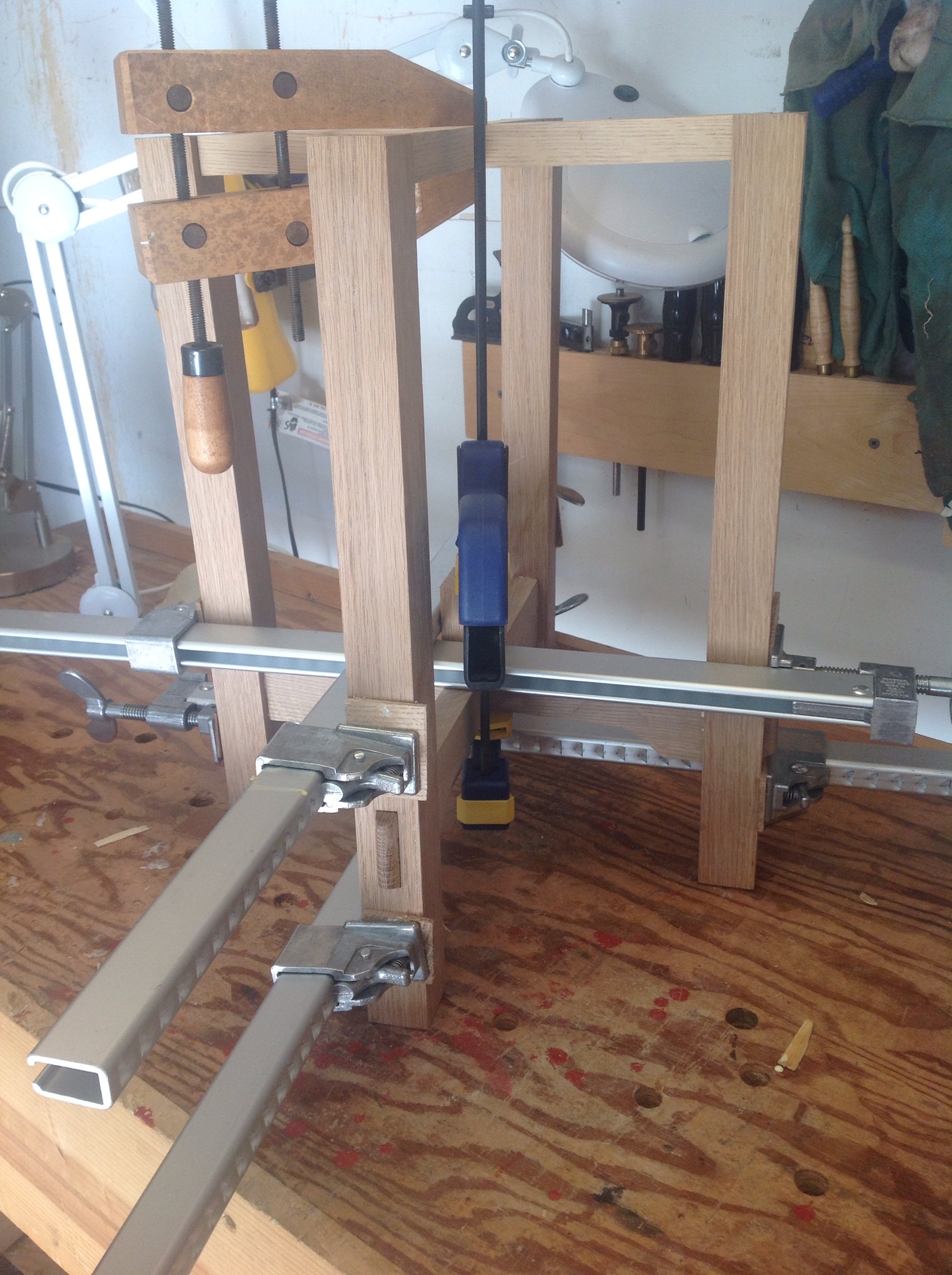 Glue up went without a hitch until I tried to insert one of the lower rails upside down. Fortunately the mistake was obvious and quickly rectified. With the clamps In place there was little do do except begin gluing up boards for the top.