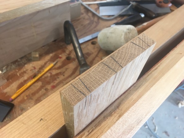 Since purchasing my shooting plane it’s changed the way I work dramatically. I used a number 5 plane for many years but tended to skip shooting on most occasions. This usually led to less then ideal joints. The shooting plane has made it quicker and easier to be accurate. With the lumber dimensioned I sawed out the tails and carefully laid out the pins. o