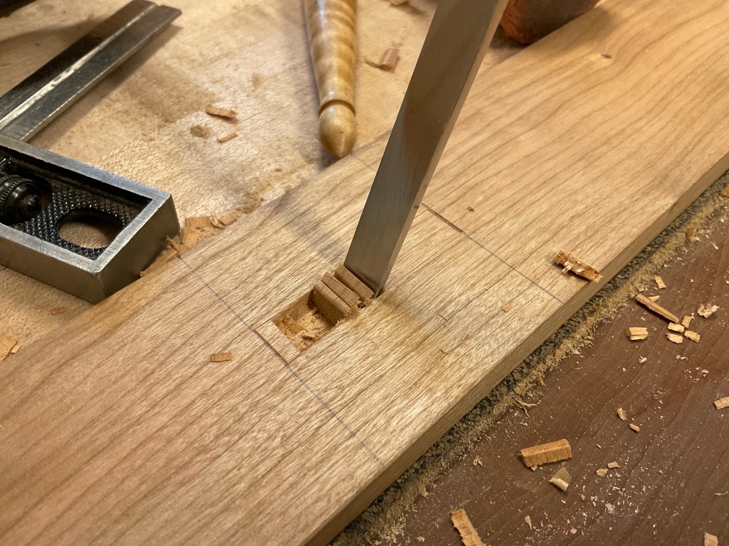 With all of the mortises laid out and the mortises on the show faces cut out by hand I turn the legs over and use the mortiser to remove the rest of the material. Some careful chisel work and the mortises arecut efficiently and accurately.