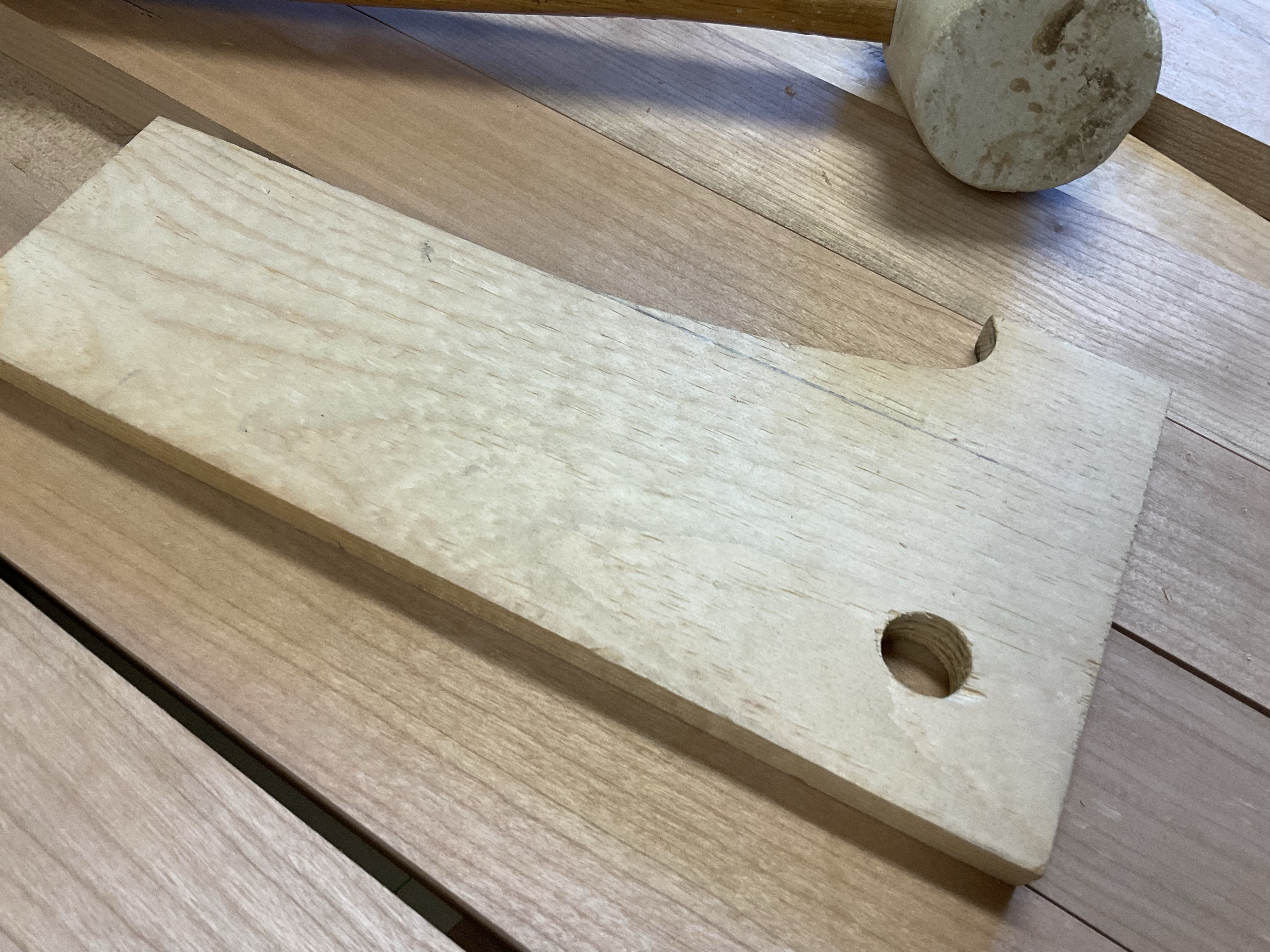 The corner of the curve is simply a 7/8” hole. I made a little jig for my drill press and drilled from both sides to have a clean hole. Next the curve along the length was sawn at the band saw. There’s many other ways to do this and in my prior build I use and a saw and chisel to removed the wast and a spoke shave to clean up the curve. Both methods are quick and relatively easy. I don’t think there was much difference in the time to clean up the curve.