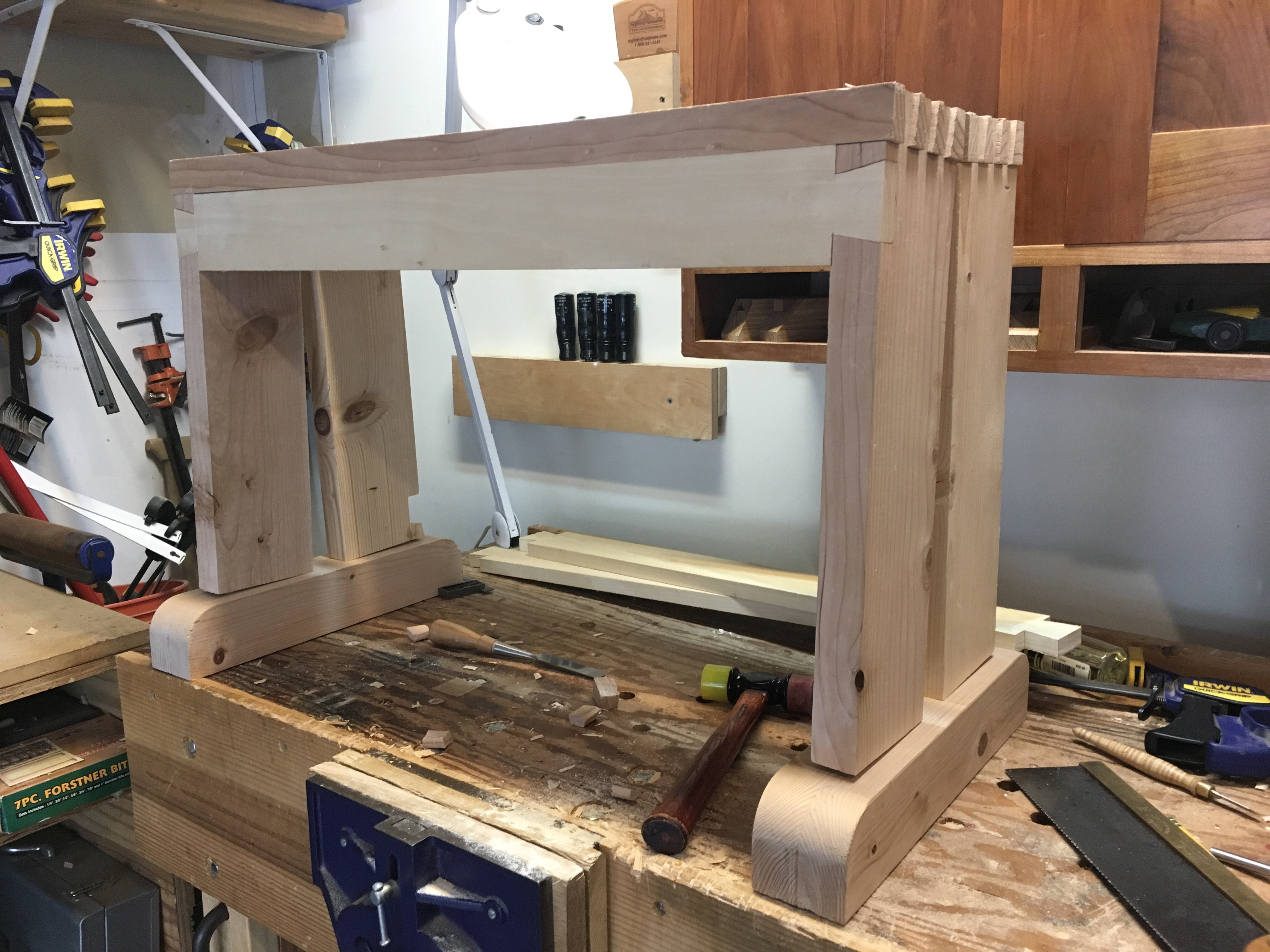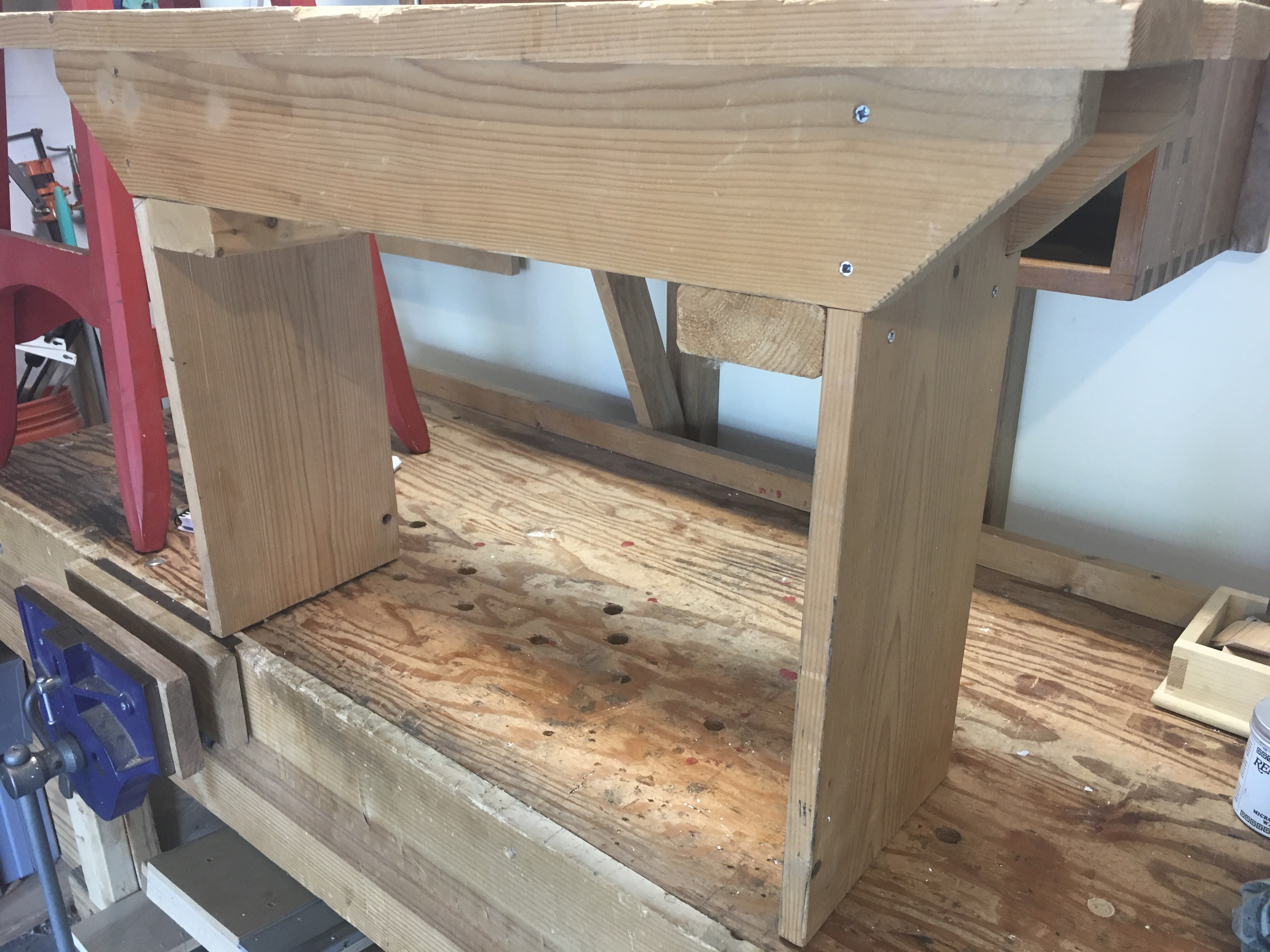 The design has allowed me to practice dovetail and mortise/tenon joints. The one complaint I have is my choice of lumber. Using several old boards of SPF was cheap but it certainly isn’t as enjoyable as hardwoods of white pine. However it’s a tool for the shop and all good practice.