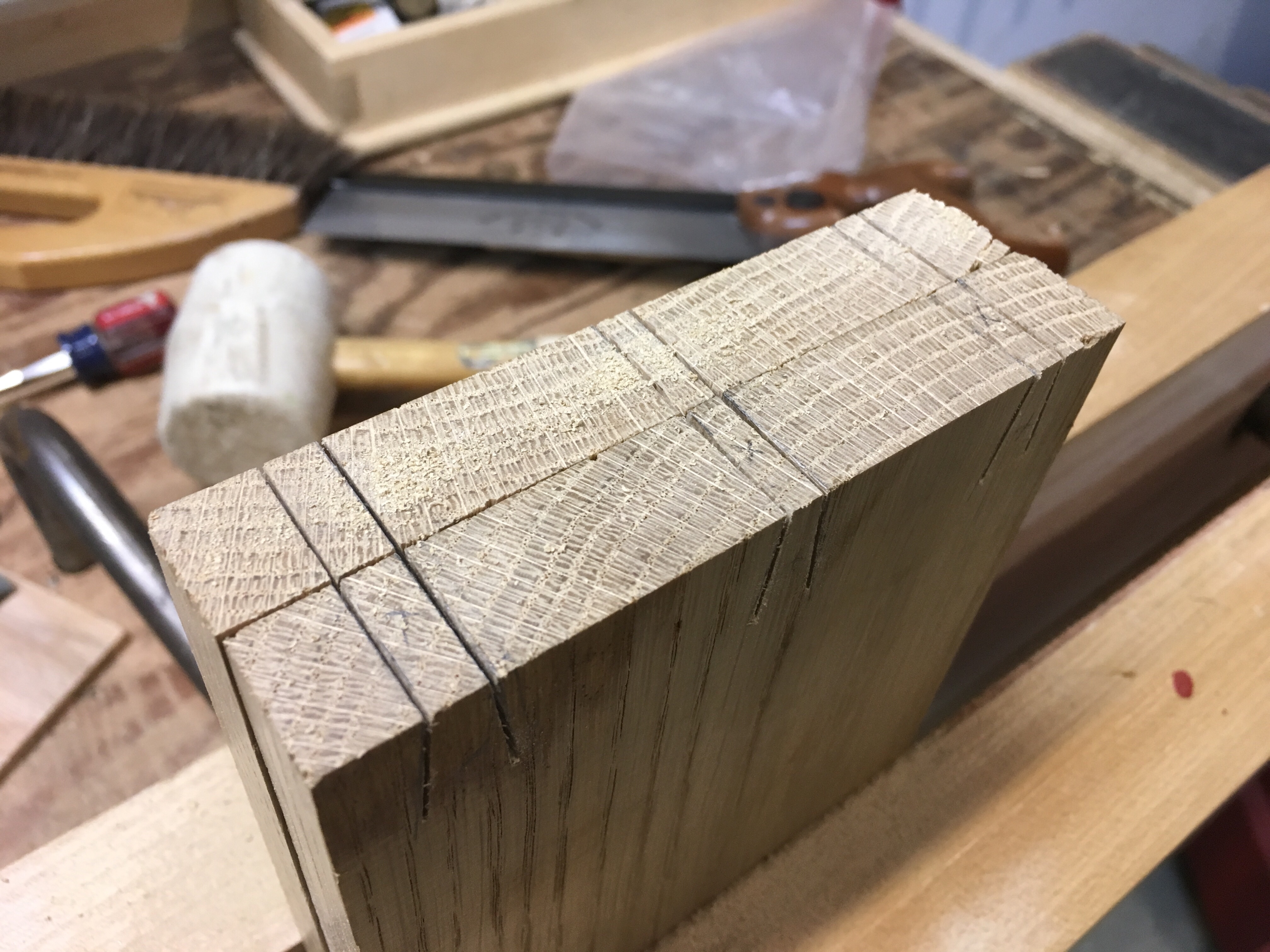No dovetails have been cut since the small tool chest project so I warmed up with a couple pieces of scrap. After marking the tails I set to work sawing and then chopping out the waste.